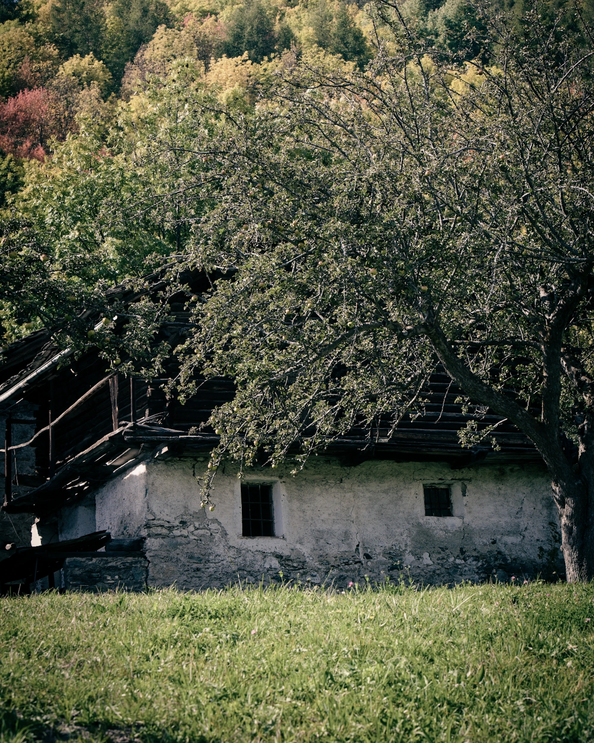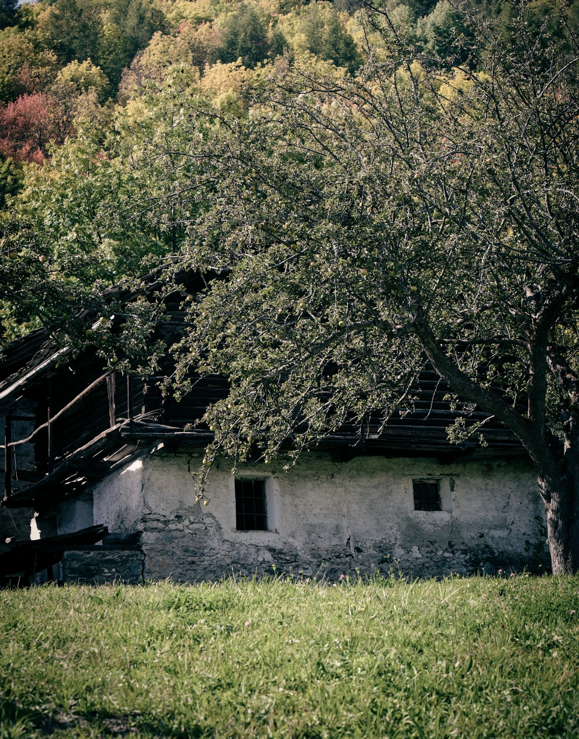 Heroic winegrowing in the Alps goes, with difficulty, up to an altitude of 1 000 m; beyond that, the vine no longer ripens. Our monumental apple trees, some planted more than a century ago, thrive instead among pastures and larch forests. With their deep roots they traverse glacial moraines, absorbing traces of quartz and gneiss that re-emerge in the calyx in the form of sharp freshness.